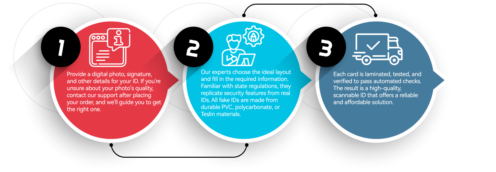 We take our time to create each ID, ensuring it meets the quality of a government-issued card. Here’s how we craft your ID:
